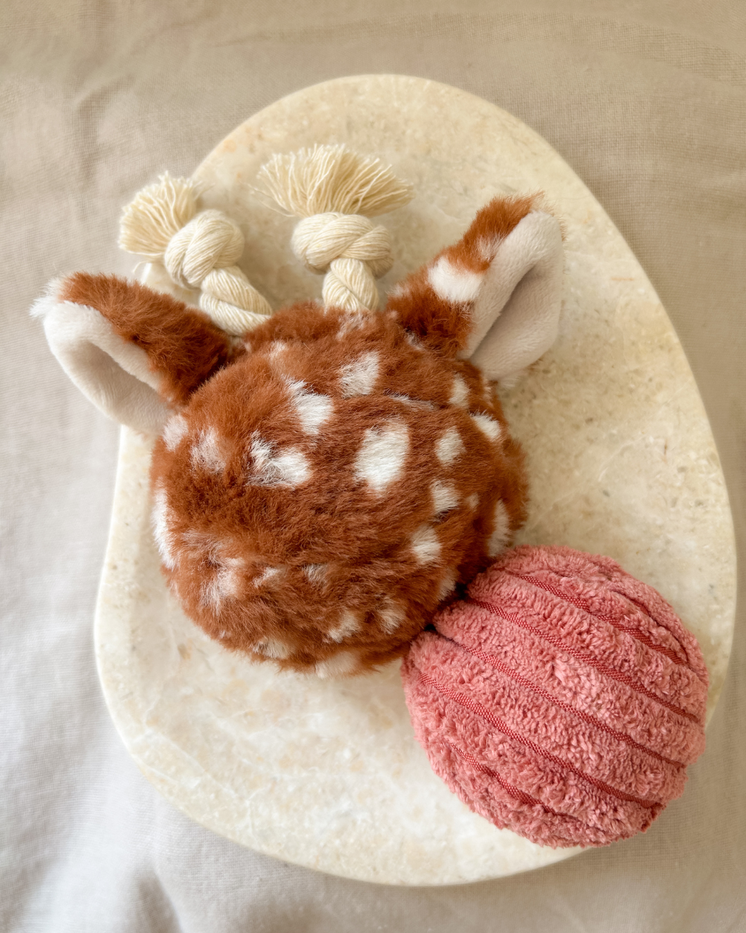 Fawn Toy: A squeaky TPR ball wrapped in soft corduroy, complete with rope ears for extra sensory fun. Its removable “coat” makes washing easy.
